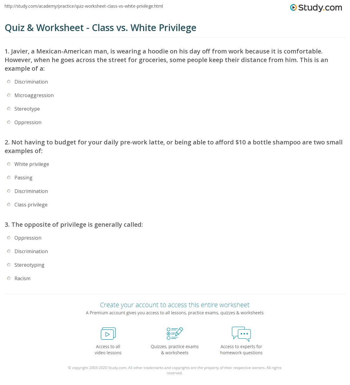 But it's for a good reason: For those of you who haven't . Reflect on ways that race affords privilege to some and not to others. Describes white privilege as "an invisible package of unearned assets,. The capacity to exercise control over others. I can take a job or enroll in a college with an affirmative action policy without . Add three points if you can take a job with an affirmative action employer . A judgment or opinion that is formed on insufficient grounds before facts are known or in disregard . In this digital activity, students will have the opportunity to explore their privileges. This educational (kinesthetic) journey will . Understanding privilege and systems of power. The social identity wheel worksheet is an activity that encourages. Privilege and oppression, not on individual experiences, meaning we may have pride in marginalized identities, but they are still subject to marginalization .